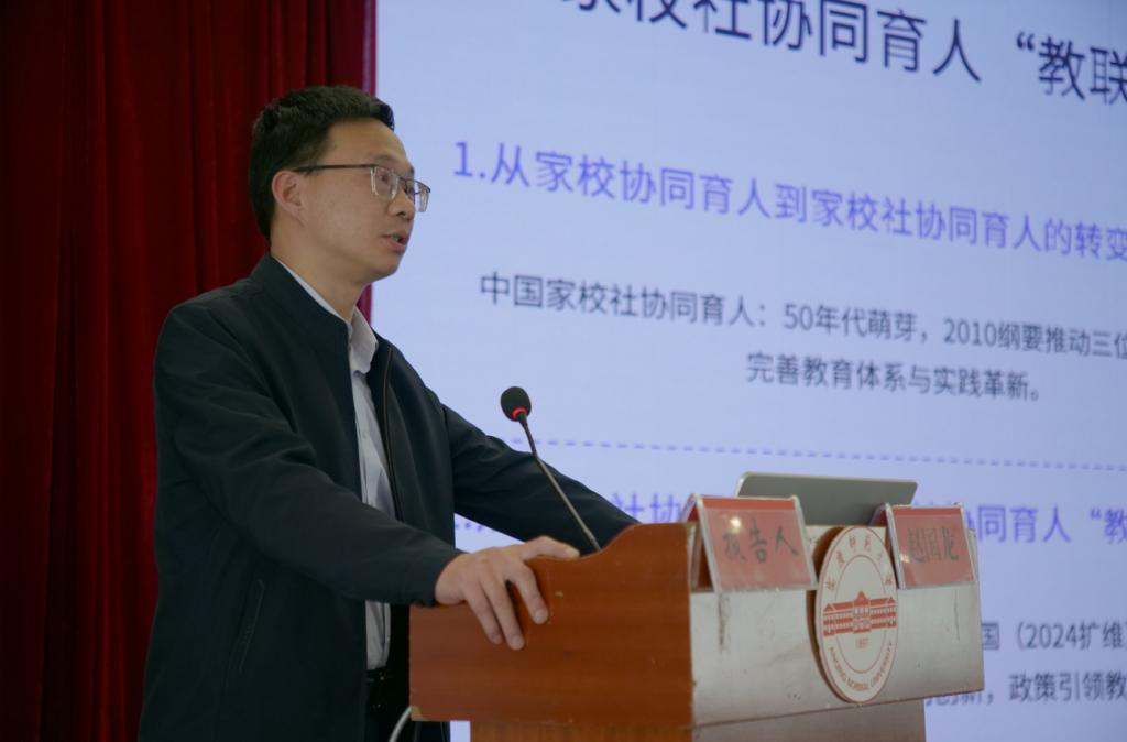 在分论坛阶段,论坛特邀嘉宾分别作了主题报告。我院院长助理赵国龙副教授聚焦“家校社协同育人”议题,阐释了构建“家校社教联体”实践模式,整合教育资源,破解育人困境的协同育人机制和实践路径。在研究生论坛环节,小学教育专业硕士研究生罗晓雨同学从智能化教育视角切入,通过实证研究,揭示了教学代理角色与声音情绪设计对儿童学习的交互影响机制,为课堂情境优化提供了新的思路。
