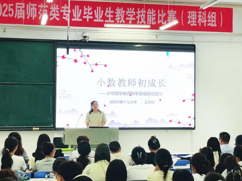 9月20日上午,信阳市骨干教师王芬梅在社科楼121教室为我院师生作题为“提升师范技能 促进职业发展”的报告。小学教育专业2022级全体学生、研究生及相关教师参加此次报告会。报告会由张祥耀主持。